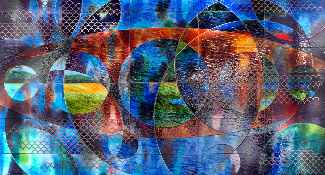 《古桥风》,名闻遐迩的江南古镇朱家角,36座古桥星罗棋布地散落在河港交错的朱家角各处,最负盛名的当数放生桥。放生桥长如玉带,状如彩虹,远远看去,在平静如镜的河水倒映下,5个半圆形桥孔变成完整的圆孔,相映成趣,别有洞天。旧称“井带长虹”。釉画作品《朱家角风情/古桥风》造型即以放生桥的圆形桥洞为主体,水波涟漪,在釉色的晕染下,蜿蜒清丽,把朱家角古镇独特的古桥风韵呈现在地铁朱家角站。